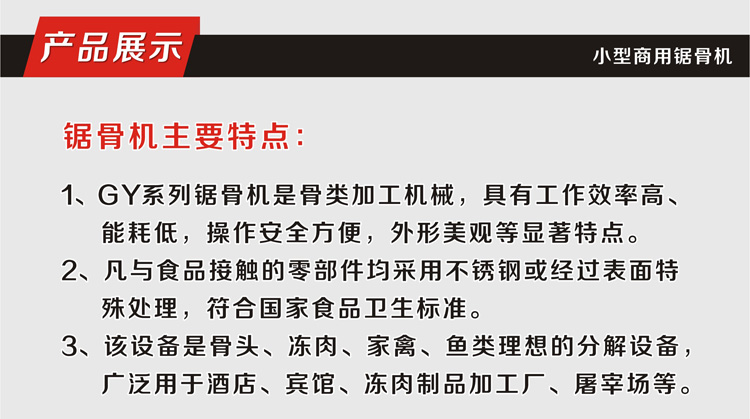 江西眾得力廚具有限公司生產(chǎn)銷售食品機(jī)械商用廚具,承接中央廚房項(xiàng)目整體解決方案!餐飲食堂后廚分解凍肉、骨頭設(shè)備選用鋸骨機(jī),輕松,快速解決問題,長短可調(diào),分解速度快,效率高,骨頭損害小。本系列鋸骨機(jī)有270型和370型兩種型號(hào),270型價(jià)格2550元,370型價(jià)格6880元