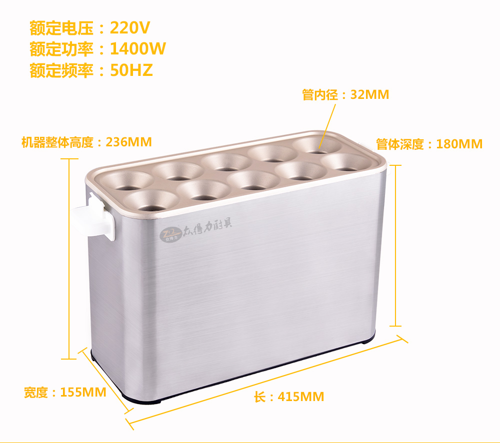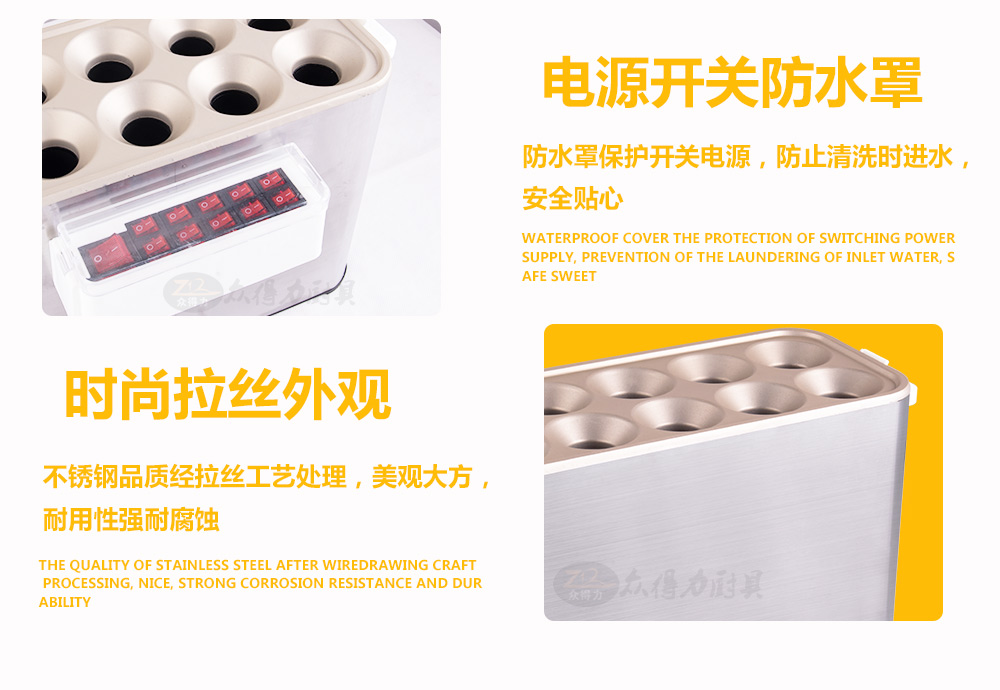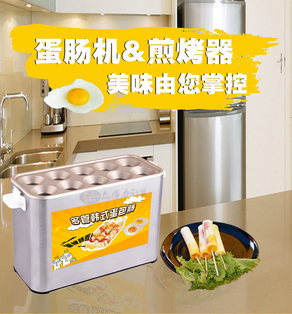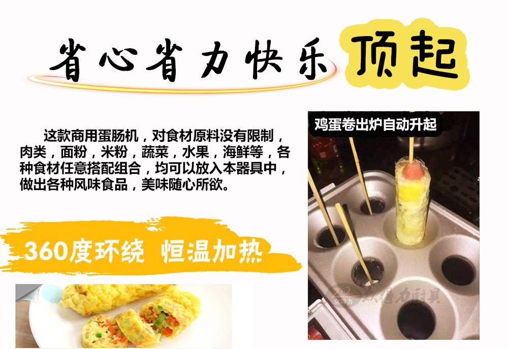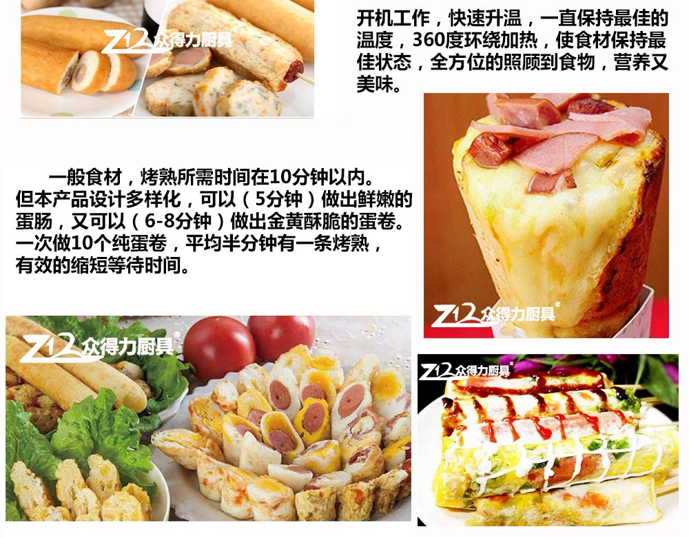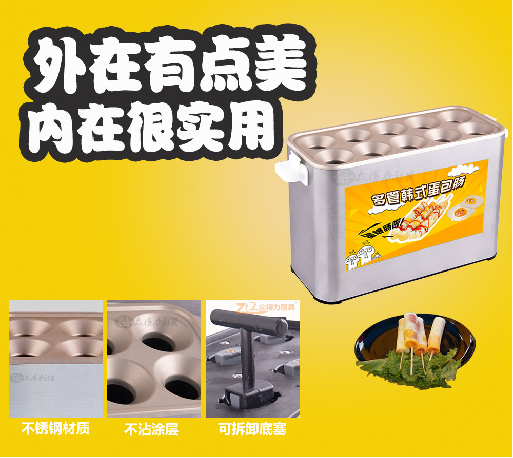 燃氣蛋腸機,電熱蛋腸機,快速升溫,360度環(huán)繞加熱,5分鐘即可做出鮮嫩的蛋腸,一次做十個蛋卷,平均每半分鐘即可烤熟一根,有效縮短等待時間,提高產(chǎn)品銷售額,蛋腸蛋卷美味吸引過往人群,小吃致富首選小設備,操作簡單。眾得力廚具,給我一個空間,服務一輩子。