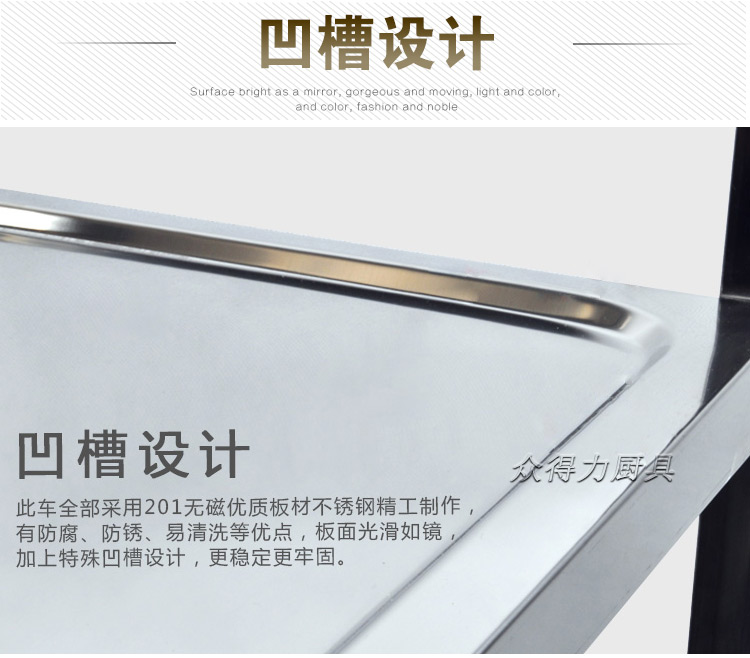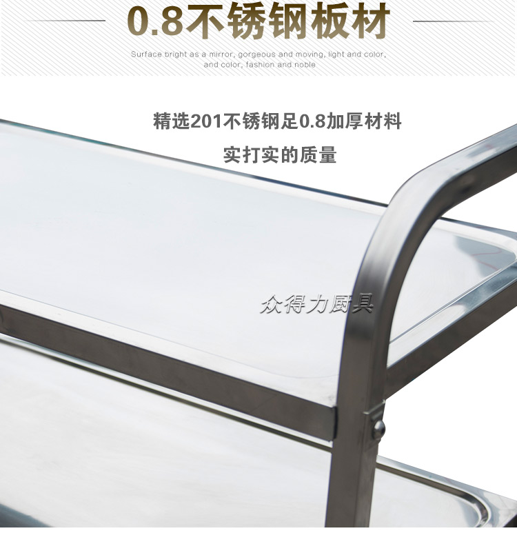 江西眾得力廚具有限公司生產(chǎn)銷售商用廚具,食品機(jī)械,提供中央廚房工程項(xiàng)目整體解決方案。不銹鋼餐車有大號(hào)、中號(hào)、小號(hào),本公司生產(chǎn)銷售的不銹鋼餐車系列均采用201無磁不銹鋼材質(zhì),板材厚度足0.8mm,整機(jī)拆裝方便,結(jié)構(gòu)牢固,承重能力強(qiáng)。